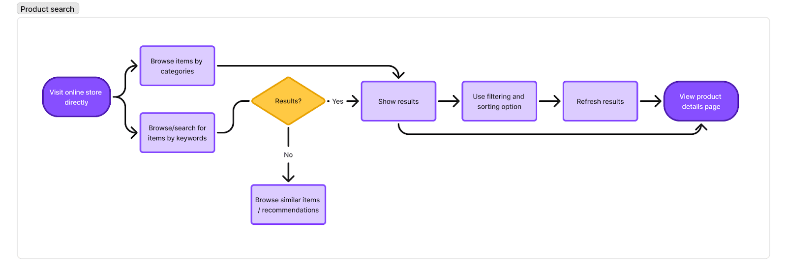 This user flow illustrates how users can easily locate their products through keyword search, and use filtering and sorting options. In addition to the product they need, we will also provide recommendations for similar products. We also consider “no results” scenarios with helpful alternatives.