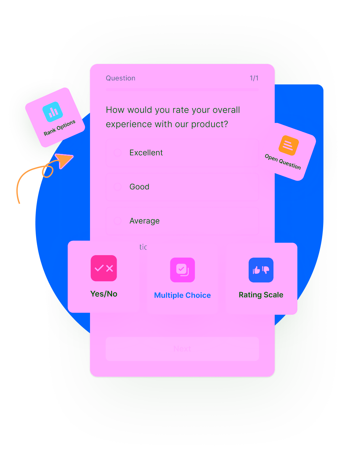 Pick from multiple choice, ratings, open text & more to ask exactly what you need.